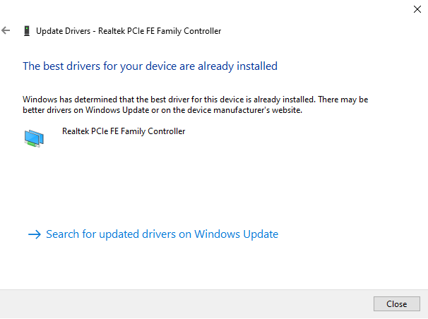 6. Jika Windows 10 berhasil menginstal driver, maka akan muncul pesan “Windows has successfully updated your drivers”. Jika driver yang digunakan sudah paling baru, maka akan tampil pesan “The best drivers for your device are already installed” .