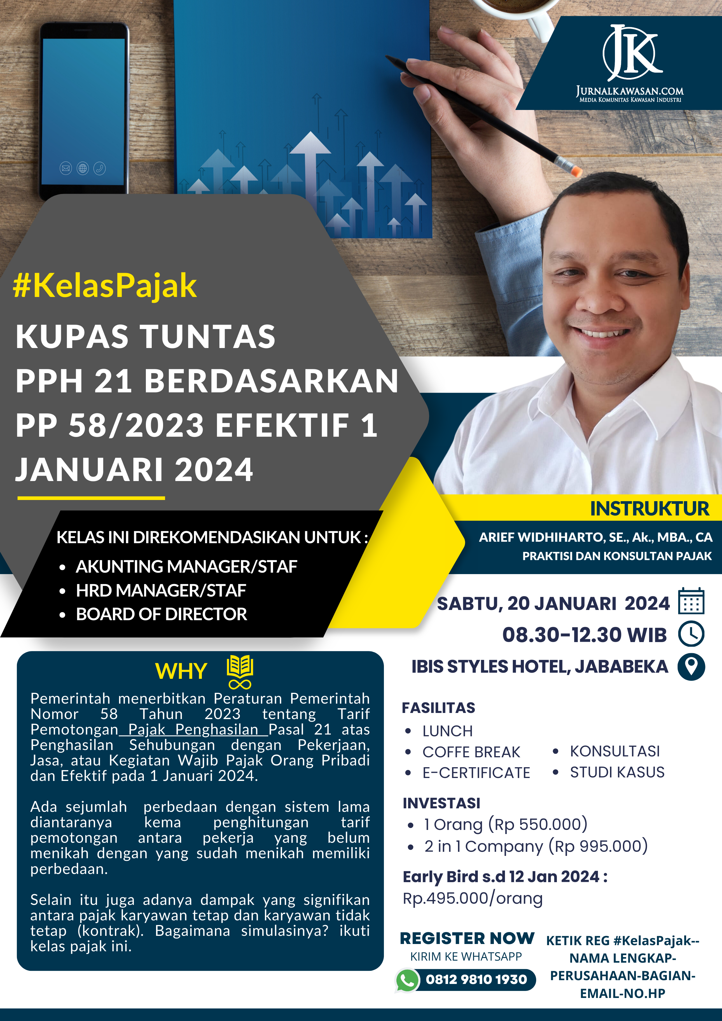 Hallo Pabrikers, pada tanggal 20 Januari 2024, JurnalKawasan.com akan menyelenggarakan Kelas Pajak dengan tema "Kupas Tuntas PPH 21 berdasarkan PP 58/2023." Acara ini diadakan di Hotel Ibis Style, Jababeka, Cikarang, dan akan menjadi peluang emas bagi perusahaan untuk mendalami perubahan perpajakan yang efektif mulai 1 Januari 2024.