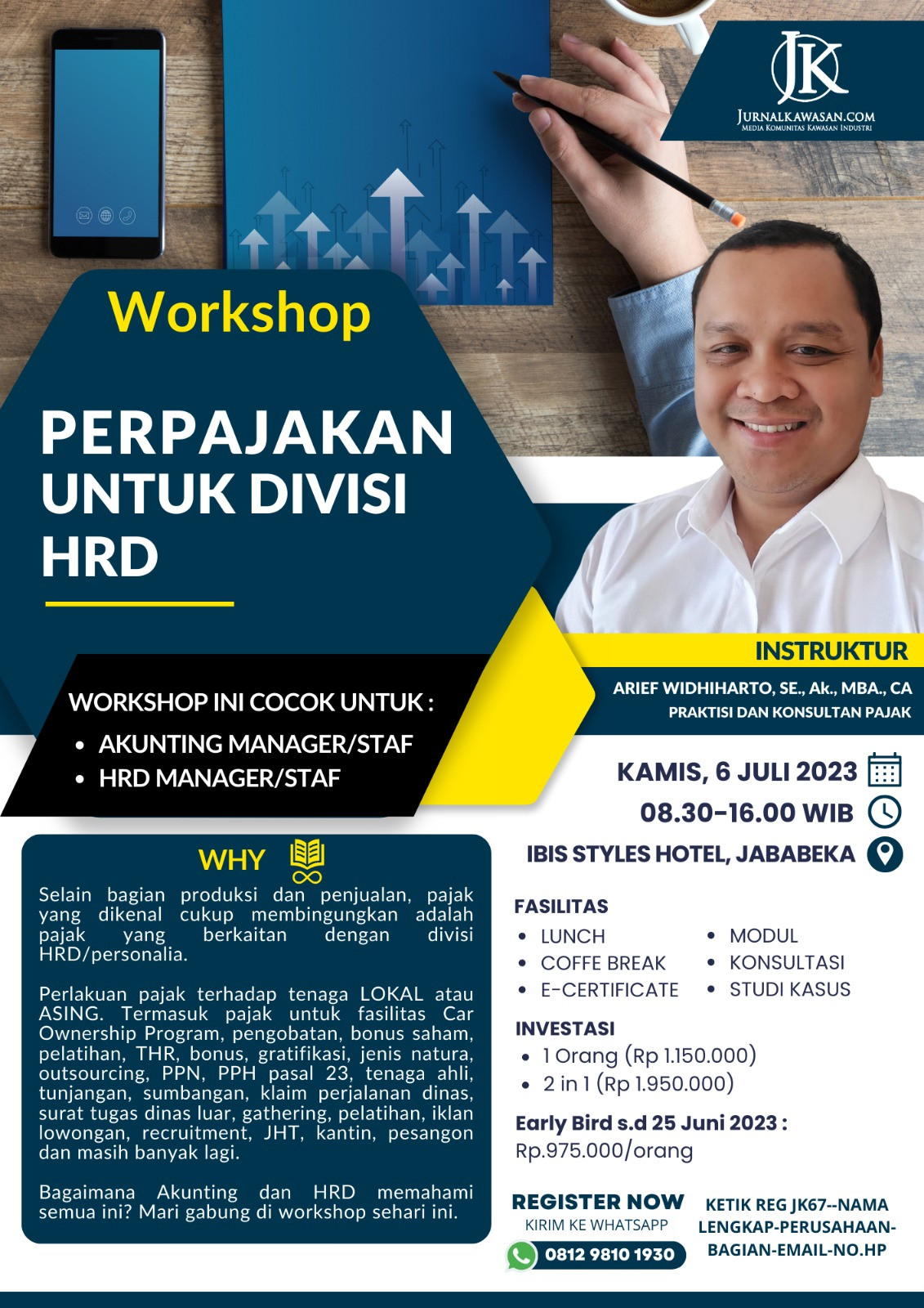 Demikian dikatakan oleh konsultan pajak, Arief Widiharto dalam seminar yang diselenggarakan oleh jurnalkawasan.com medio April kemarin. Arief menuturkan Pelatihan pajak di divisi HRD akan mempelajari masalah perpajakan pada saat merekrut, membayar, pensiun maupun segala kebijakan yang berhubungan dengan fasilitas tenaga kerja. Misalnya begitu juga bagaimana perlakuan pajak untuk fasilitas